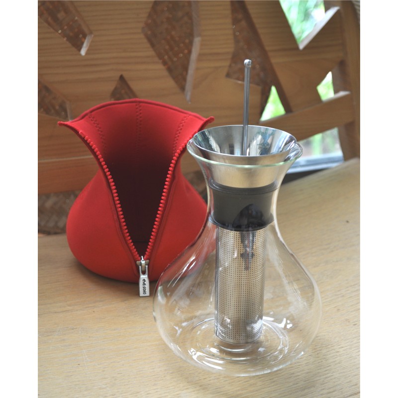 Elégante théière de la marque danoise EVA SOLO (Tools Design) dans sa robe zippée fourreau rouge en néoprène. La housse est lavable en machine à laver le linge à 30 °C.